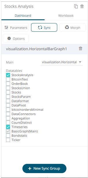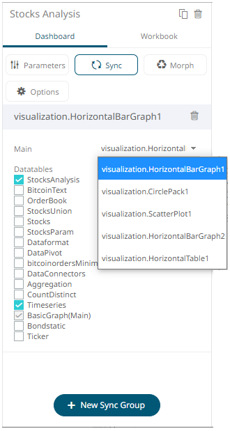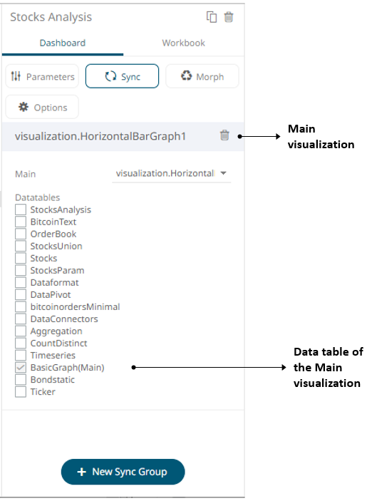 It is indicated at the top section of the tab that this visualization will be the Synchronization Main and will be the basis for the shared and visible variables across the selected data table(s).