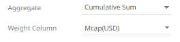 · If you set the aggregation method to Cumulative Sum, Cumulative Sum By Max, Intercept, Percent ot Total Change, Percent of Weight Parent, Percent of Weight Total, Ratio, Slope, Weighted Harmonic Mean, Weighted Mean, or Weighted Sum, the Weight Column drop-down list is enabled and displays a list of numeric data columns in the selected data table that can be used as the weight column for the aggregate.