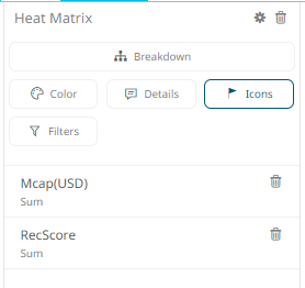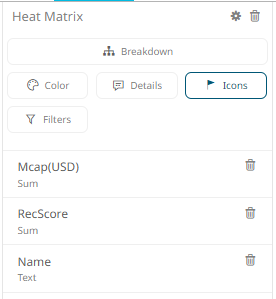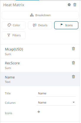 1. To associate columns from the data table, drag and drop them to the Icons variable drop area. Select a numeric column to display the corresponding configuration pane.