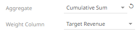 · If you set the aggregation method to Cumulative Sum, Cumulative Sum by Max, Intercept, Percent of Total Change, Percent of Weight Parent, Percent of Weight Total, Ratio, Slope, Weighted Harmonic Mean, Weighted Mean, or Weighted Sum, the Weight Column drop-down list is enabled and displays a list of numeric data columns in the selected data table that can be used as the weight column for the aggregate.