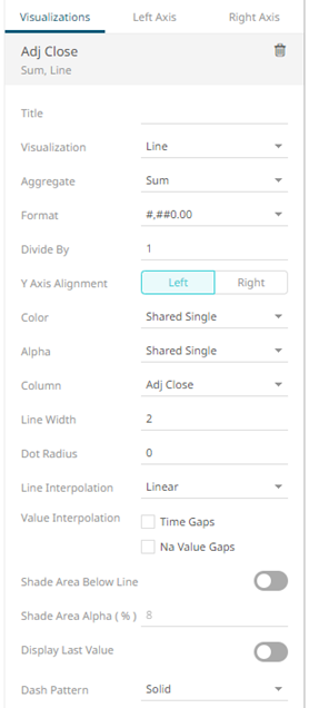 The column is added under the Visualizations tab list and by default, uses the Line graph and the Left Y-Axis alignment to the time combination visualization.
