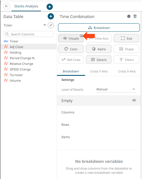 3. Drag and drop time series columns from the Data Table pane to the Visuals variable drop area.