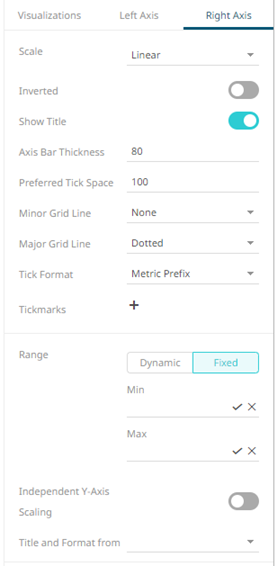 The visible range for the Left and Right Y-axis variables can either be calculated dynamically (Dynamic Range) or set between predetermined limits by selecting Fixed Range. This enables the Min and Max text boxes and populates them with default values taken from the data set. |
