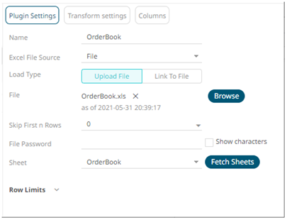 This lists options specific to the data source. In the case above for Sample 1 (MS Excel), it lists the file path to the Excel workbook, and the sheet to be used.