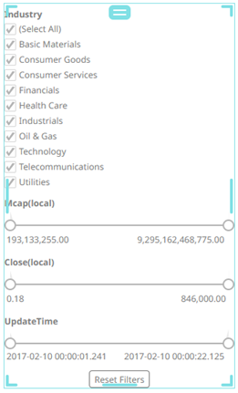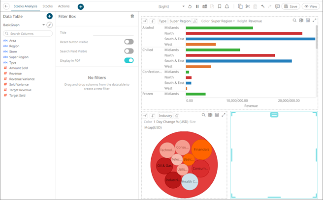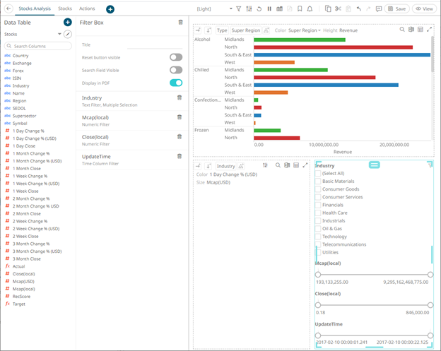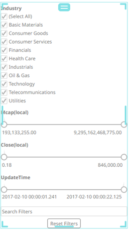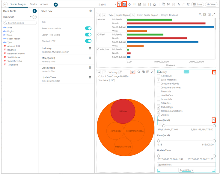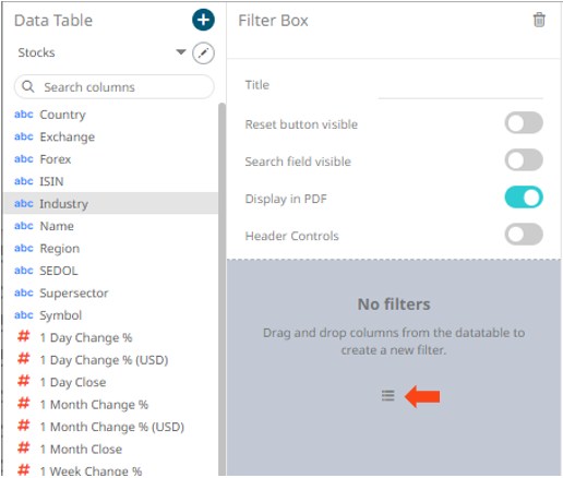 Dashboards specific filters can be applied by adding and populating a filter box which is a container for numeric and categorical (text) filters.