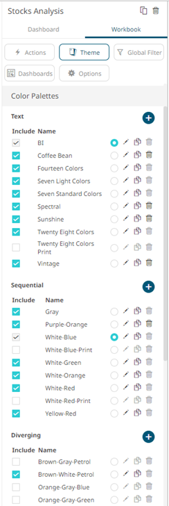 · A user with an Administrator role, can also create, modify, duplicate, or delete color palettes on the Color Palettes tab of the Themes page in the Panopticon Visualization Server. · Changes made on the Color Palettes section of the Theme Settings pane will only be associated with the inline theme of the workbook in the Web client and will not be reflected on the Color Palettes tab of the Themes page in the Panopticon Visualization Server.