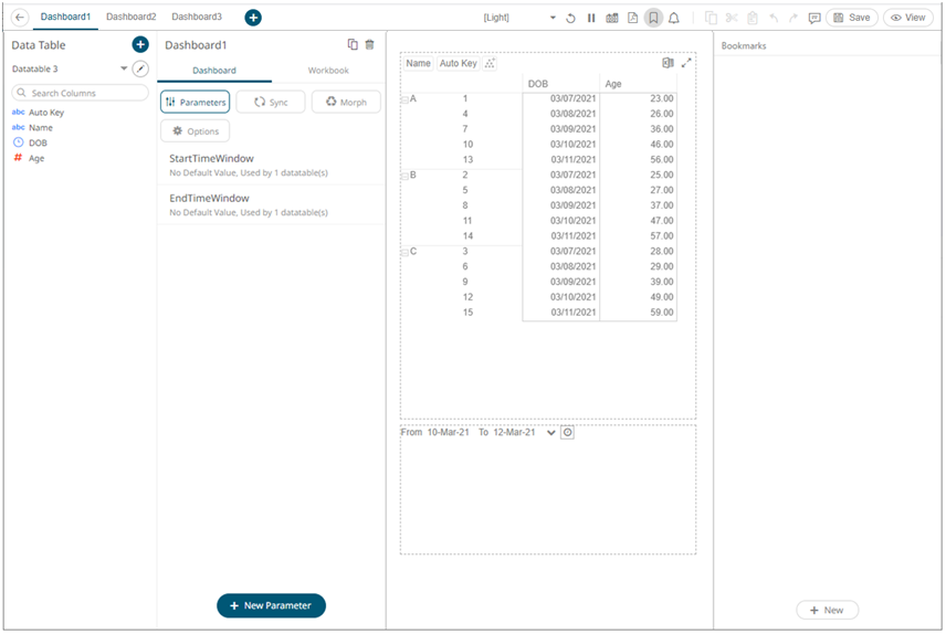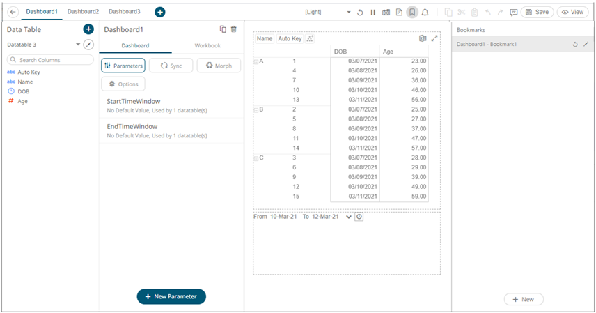 For example, if the dashboard contains an Action Date Picker that defaults to now, and that same parameter value is excluded from the bookmark, then the Action Date Picker default value will be the value when the bookmark is opened.