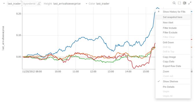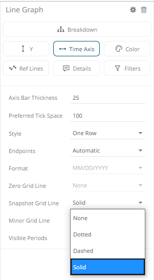 The Set Snapshot Here option is only available in the time series visualization context menu when the Snapshot Grid Line is rendered or set to Dotted, Dashed, or Solid in the Time Axis variable.