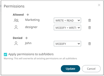 · leave the Apply Permissions to Subfolders box unchecked and modify the permission properties of the subfolders