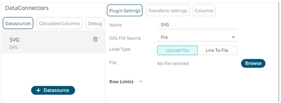 1. Select SVG from the Data Sources pane. The SVG Settings pane and the retrieved SVG source are displayed.