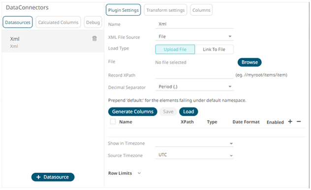 1. Select XML from the Data Sources pane. The XML Settings pane and the retrieved XML source are displayed.