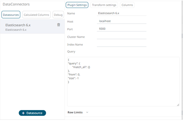 1. Select Elasticsearch 6.x from the Data Sources pane. The Elasticsearch 6.x Settings pane and the retrieved Elasticsearch 6.x source are displayed.