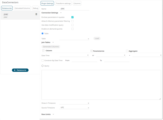 1. Select JDBC from the Data Sources pane. The JDBC Settings pane and the retrieved JDBC source are displayed.