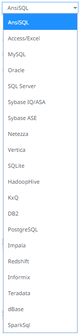 You can select any of the following SQL dialects: AnsiSQL, Access/Excel, MySQL, Oracle, SQL Server, Sybase IQ/ASA, Sybase ASE, Netezza, Vertica, SQLite, HadoopHive, KxQ, DB2, PostgreSQL, Impala, Redshift, Informix, Teradata, dBase, SparkSQL.