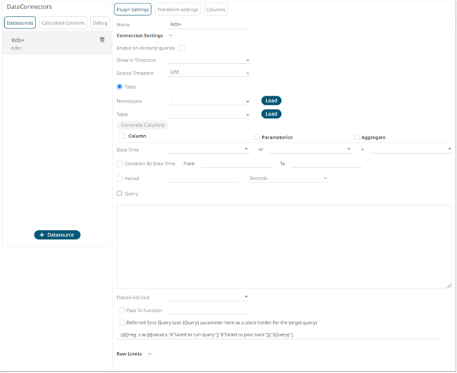 1. Select Kdb+ from the Data Sources pane. The Kdb+ Settings pane and the retrieved Kdb+ source are displayed.