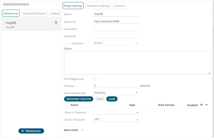 1. Select ksqlDB from the Data Sources pane. The ksqlDB Settings pane and the retrieved ksqlDB source are displayed.