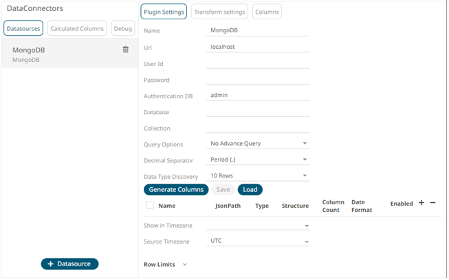 1. Select MongoDB from the Data Sources pane. The MongoDB Settings pane and the retrieved MongoDB source are displayed.