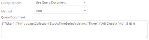 Queries from the documentation look like this: db.inventory.find ( {type: "snacks"} ). The database and collection are already defined in the UI and the Find operation is handled in the code. The user only needs to enter the query document: