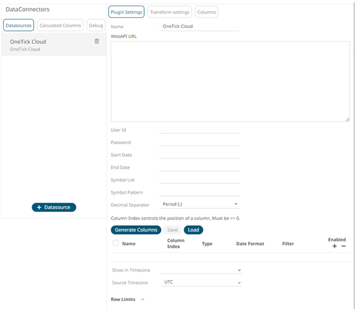 1. Select OneTick Cloud from the Data Sources pane. The OneTick Cloud Settings pane and the retrieved OneTick Cloud source are displayed.
