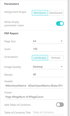 The header to be displayed on the PDF output. Default is: $WorkbookName - $DashboardName $Date $Time |