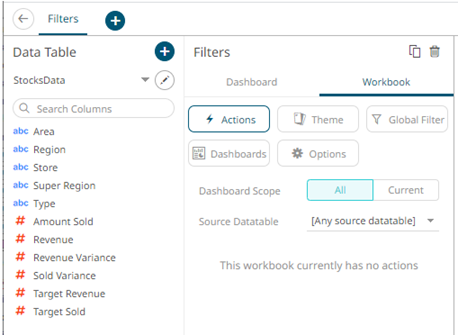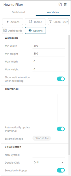1. On the Dashboard and Workbook Settings pane, click the Workbook tab.