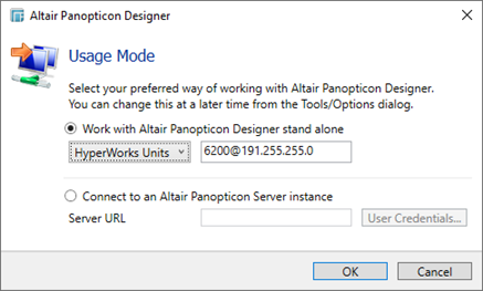 In the Usage Mode dialog, click Work with Altair Panopticon Designer (Desktop) stand-alone radio button and select HyperWorks Units in the drop-down box.