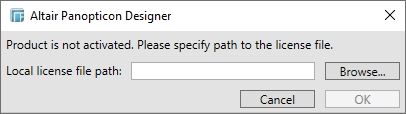 · In the Altair Panopticon Options dialog, if the selected license is Volume License File but there is no license file selected, when you open Panopticon Designer (Desktop), this dialog displays that allows you to do so: