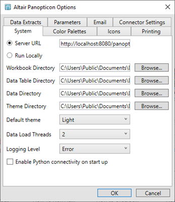 To change from stand-alone usage mode to connecting to a Panopticon Visualization Server instance, or vice versa, you can do this from the Tools > Options.