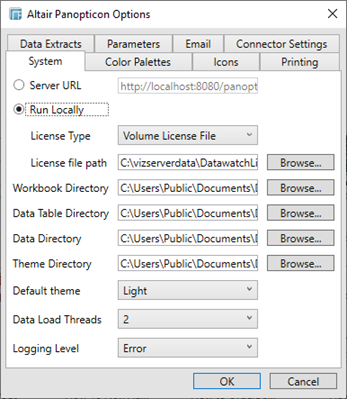 Enter the location of the Altair License Server where the license file is located then click OK. · In the Altair Panopticon Options dialog, if Server URL is selected but there is no specified Panopticon Visualization Server URL, when you open Panopticon Designer (Desktop), this dialog displays that allows you to do so: