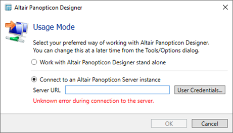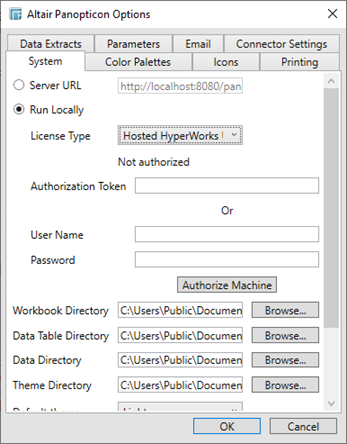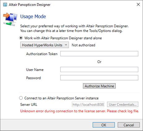 Enter the URL of the Panopticon Visualization Server that you will connect to and then click OK. · In the Altair Panopticon Options dialog, if the selected license is Hosted HyperWorks Units but there is no specified Authorization Token or User Name and Password, when you open Panopticon Designer (Desktop), this dialog displays that allows you to do so: