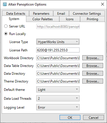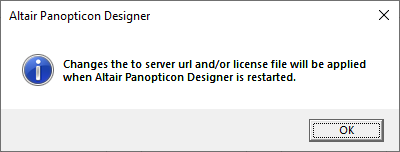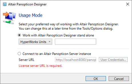 Click Browse to select the volume-based license file and then OK. · In the Altair Panopticon Options dialog, if the selected license is HyperWorks Units but there is no specified License Server URL, when you open Panopticon Designer (Desktop), this dialog displays that allows you to do so: