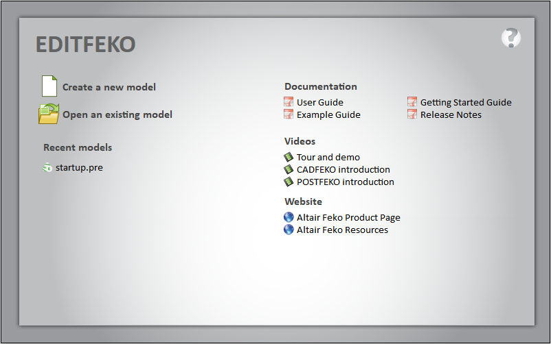 The Feko start page is displayed when starting a new instance (no models are loaded) of CADFEKO, EDITFEKO or POSTFEKO.