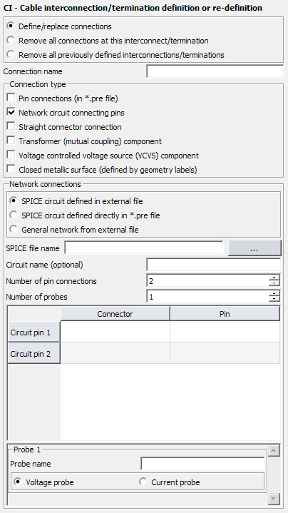 - The file name of the SPICE circuit to be connected between two pins. The file name is required when the SPICE circuit is loaded from an external file, but should not be used when entering the SPICE circuit directly in the .pre file. When the SPICE circuit is included directly in the .pre file, a field will be displayed where the circuit can be entered.