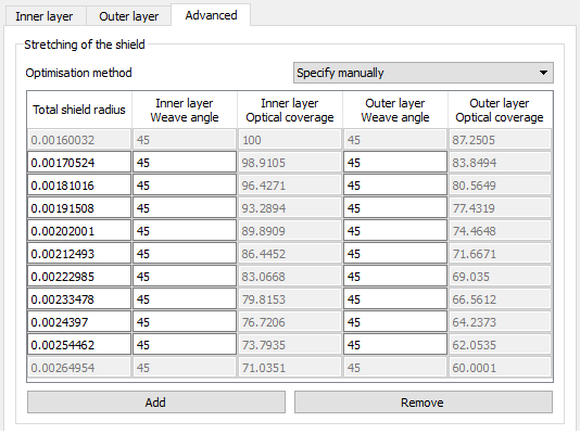 When creating a cable shield, you need to specify for each layer the impedance and admittance. The following combinations