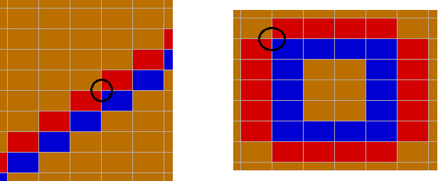Figure 6. If a voxel mesh is applied to the same model as the top example and a similar edge port is specified, it results in an invalid edge port as displayed in the section views. The black circles indicate an example of a point with conflicting potentials.