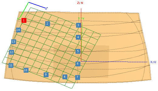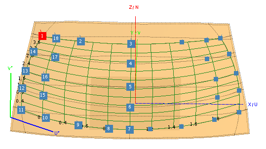 Number U′ V′ 12 0 1 15 1 13 0 2 16 2 14 0 3 17 3 18 4 - Click Create to create the constrained surface and close the dialog.