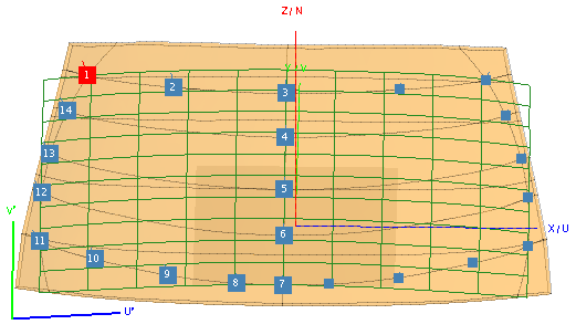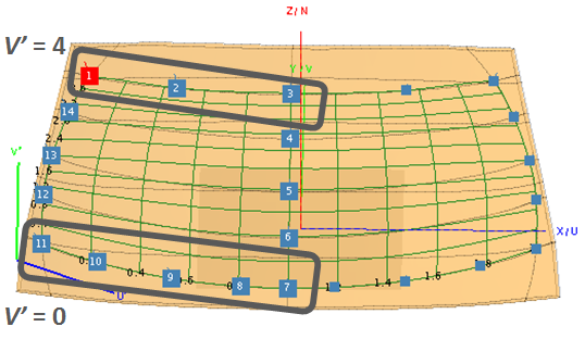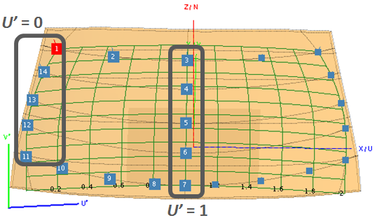 Number U′ V′ 3 1 4 1 5 1 6 1 7 1 1 0 14 0 13 0 12 0 11 0 For this example, corner point 1 and points 14, 13, 12 and 11 are set to U′=0.Points 3, 4, 5, 6 and 7 were defined in Step 5 as it is located on the symmetry plane.