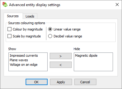 You can use the Show and Hide panels to show or hide sources and loads selectively. Additional options for sources are Colour by magnitude and Scale by magnitude. These options are often used in conjunction with aperture sources, electric dipoles, magnetic dipoles and impressed currents.