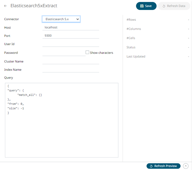 1. On the New Data Extract page, select Elasticsearch 5.x in the Connector drop-down list.