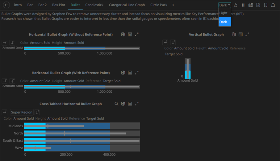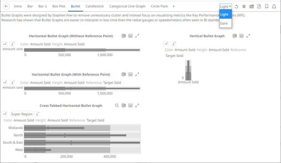 On an opened workbook, users can dynamically switch between the two provided default workbook themes: Light or Dark.
