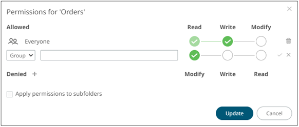 The Apply Permissions to Subfolders: · is only enabled when there is an existing subfolder. · does not affect the personal folders.