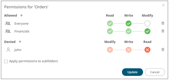 The Apply Permissions to Subfolders check box is not enabled when defining the permissions for a subfolder.