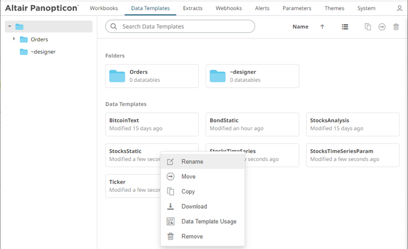 1. On the List of Grid view, right-click on a data template then select Rename on the context menu.