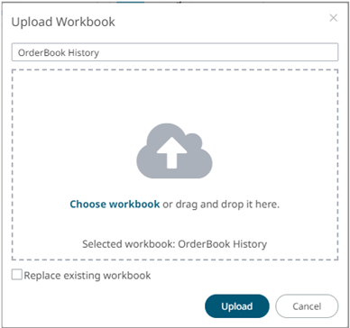 Users with an Administrator role can upload workbooks to the currently selected folder in the Workbooks page.