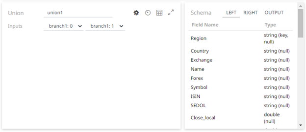 The left input stream automatically connects to the currently-selected operator. You can select another ID of the operator that will be the source of the data in the Inputs drop-down list. Then select the right input stream. The preview of the data (LEFT, RIGHT and OUTPUT) is displayed in the Schema panel. |