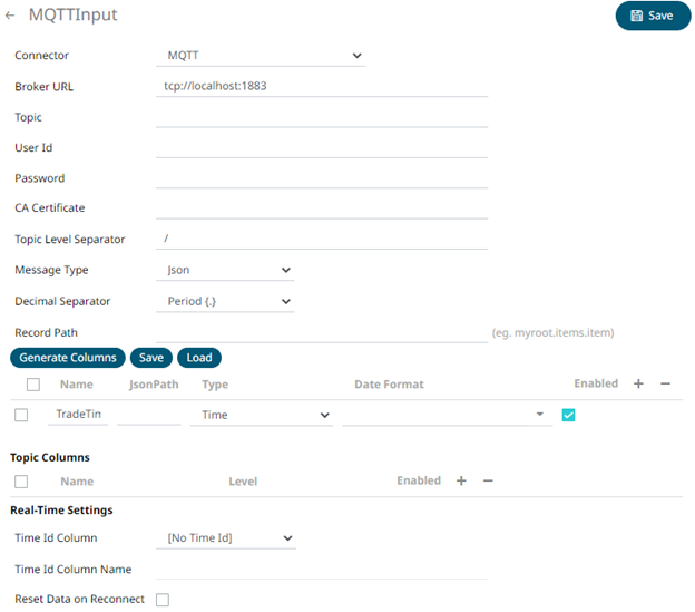 The Topic Columns section shows and allows defining data table columns and mapping them to topic hierarchy levels (index based from left, 0 based).