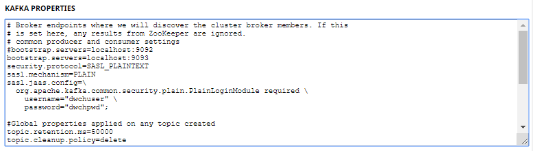 However, if the kafka.properties file is not available, the Kafka Properties box will display a blank Kafka Properties box: