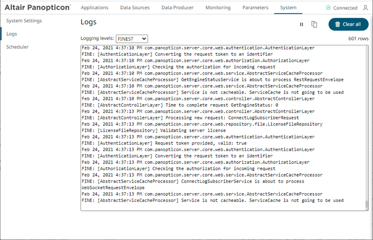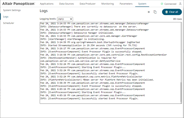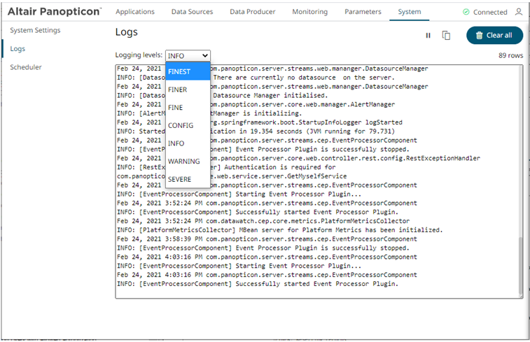 1. Under the System tab, click the Logs link. Initially, the default level (INFO) logs are displayed.
