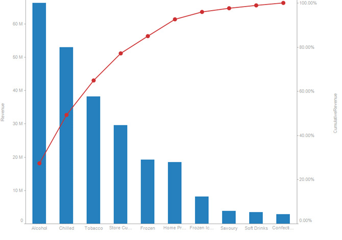 A common usage of the Pareto chart is to compare actual values to forecast/target values, with the actuals being displayed as the bar, and the forecast as the line.  In this scenario, typically both measures are bound to the left Y axis, so that they have comparable scales.