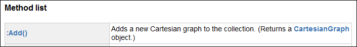 Figure 2. A snippet of the CartesianGraphCollection which shows the Method list.Note: View the :Add method in the Method list.Note: CartesianGraphCollection resides under the Application object.